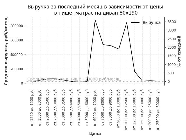 Средняя выручка в нише - 23800 руб./месяц. Максимальная выручка 878900 руб./месяц, на 3590% больше среднего в нише, была при цене от 6000 до 7000 руб. руб.