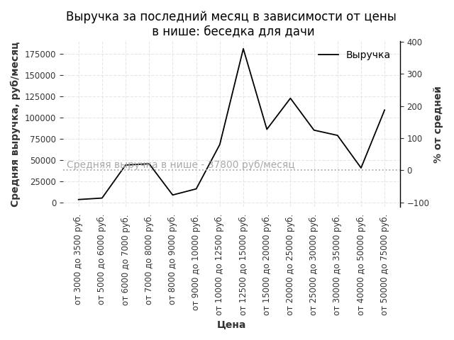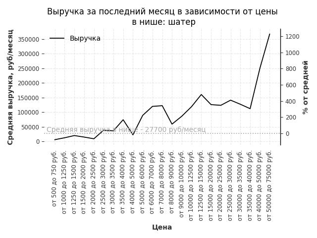 Средняя выручка в нише - 37800 руб./месяц. Максимальная выручка 180800 руб./месяц, на 380% больше среднего в нише, была при цене от 12500 до 15000 руб. руб.