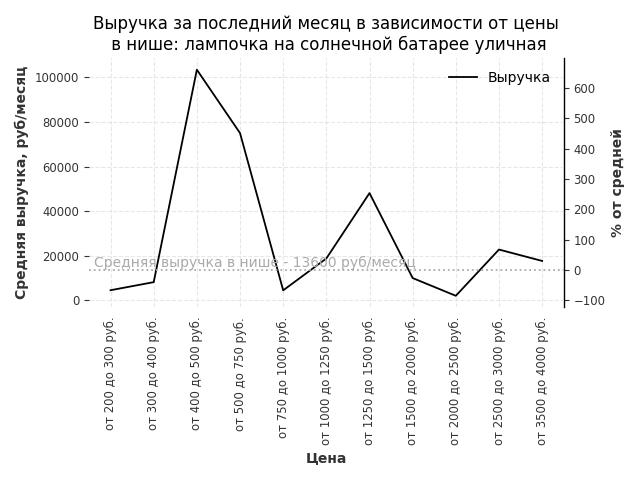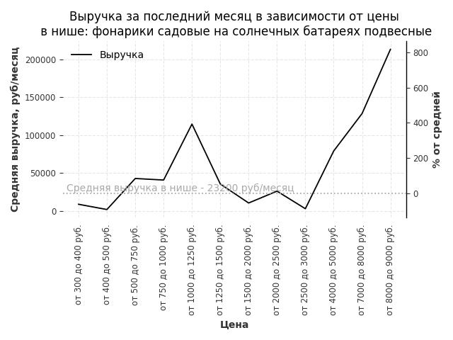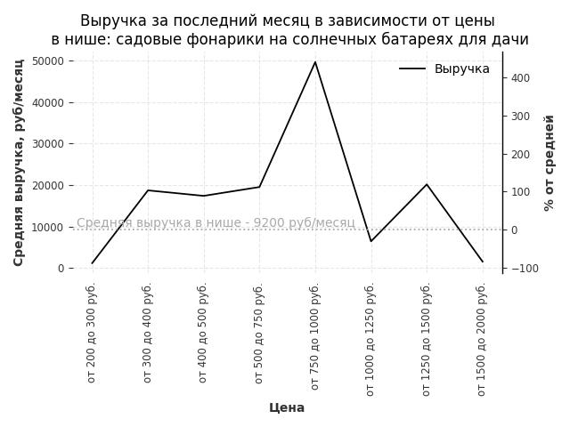 Средняя выручка в нише - 9200 руб./месяц. Максимальная выручка 49700 руб./месяц, на 440% больше среднего в нише, была при цене от 750 до 1000 руб. руб.