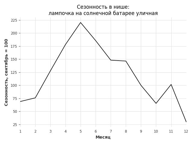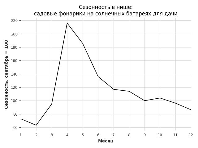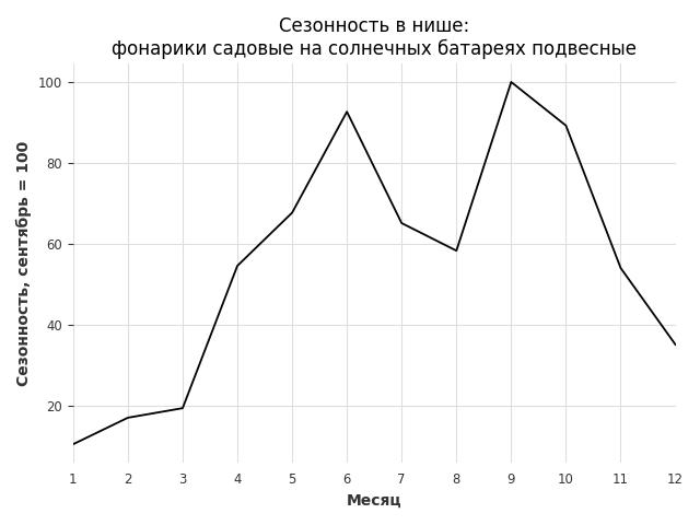 Сезонность в нише сильная. Пик сезонных продаж в нише - сентябрь. В ближайшие месяцы можно ожидать сезонного спада продаж до 65%.