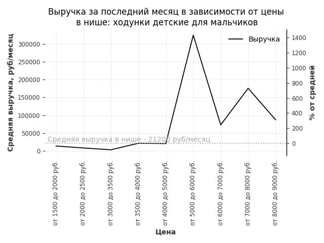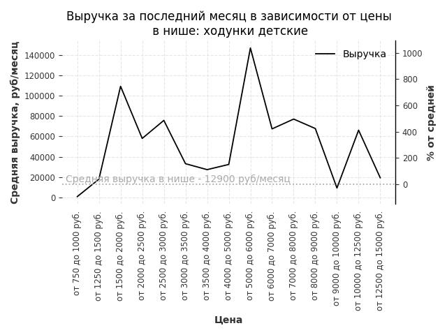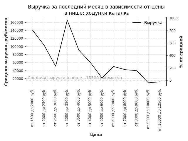 Средняя выручка в нише - 15500 руб./месяц. Максимальная выручка 165100 руб./месяц, на 970% больше среднего в нише, была при цене от 3000 до 3500 руб. руб.