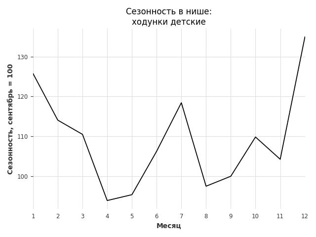 Сезонность в нише слабая. Пик сезонных продаж в нише - декабрь. В ближайшие месяцы можно ожидать сезонного роста продаж до 34%.
