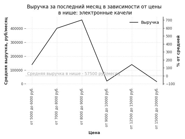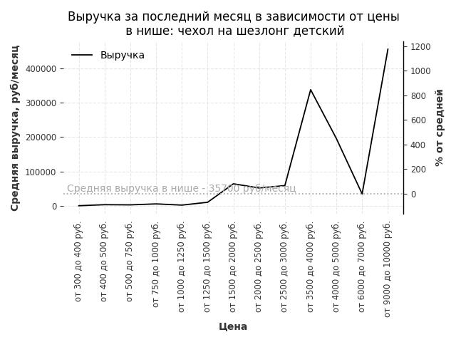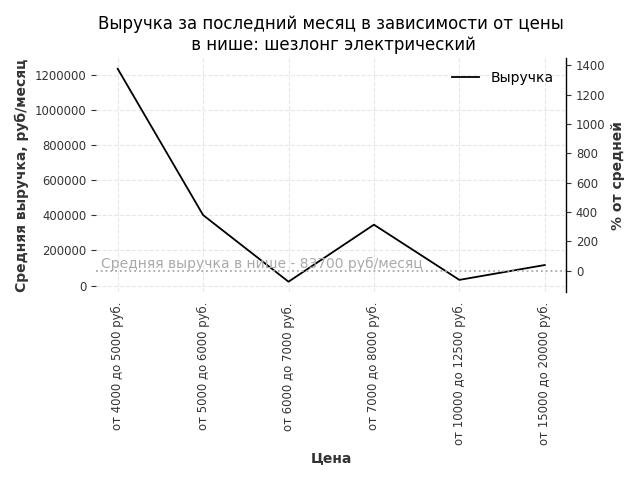 Средняя выручка в нише - 57500 руб./месяц. Максимальная выручка 460900 руб./месяц, на 700% больше среднего в нише, была при цене от 8000 до 9000 руб. руб.