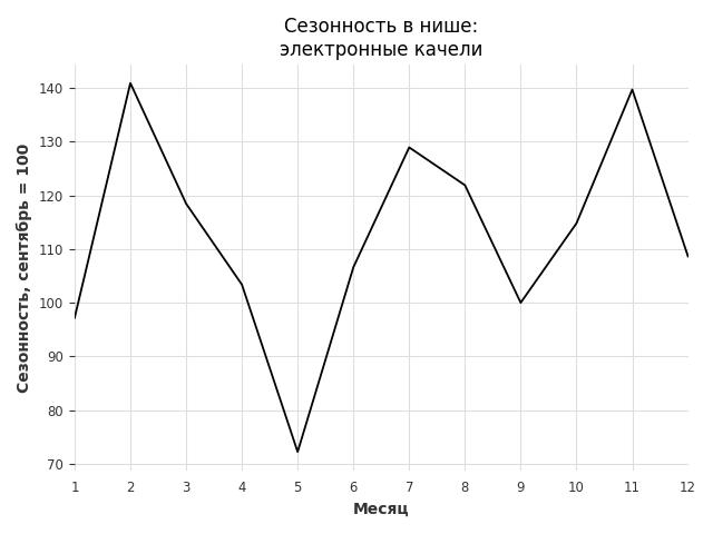 Сезонность в нише слабая. Пик сезонных продаж в нише - февраль. В ближайшие месяцы можно ожидать сезонного роста продаж до 39%.