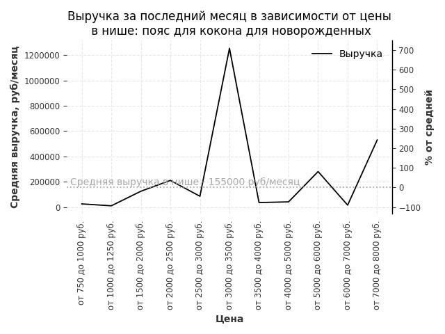 Средняя выручка в нише - 155000 руб./месяц. Максимальная выручка 1254800 руб./месяц, на 710% больше среднего в нише, была при цене от 3000 до 3500 руб. руб.