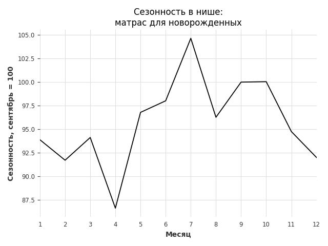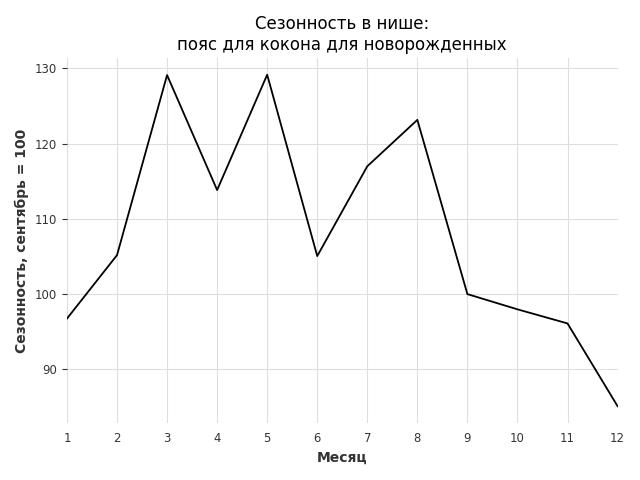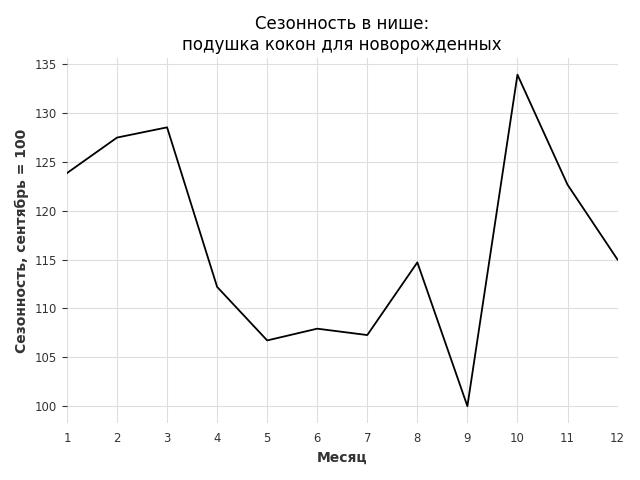 Сезонность в нише слабая. Пик сезонных продаж в нише - октябрь. В ближайшие месяцы можно ожидать сезонного роста продаж до 33%.