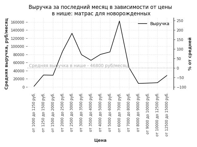 Средняя выручка в нише - 46800 руб./месяц. Максимальная выручка 162100 руб./месяц, на 250% больше среднего в нише, была при цене от 6000 до 7000 руб. руб.