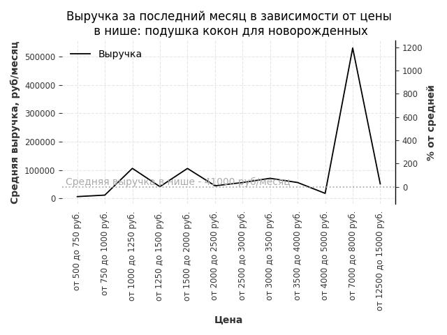 Средняя выручка в нише - 41000 руб./месяц. Максимальная выручка 529900 руб./месяц, на 1190% больше среднего в нише, была при цене от 7000 до 8000 руб. руб.