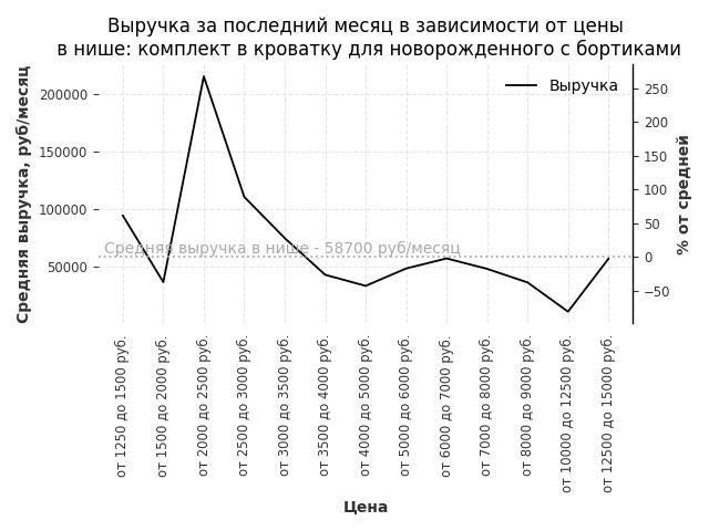 Средняя выручка в нише - 58700 руб./месяц. Максимальная выручка 215600 руб./месяц, на 270% больше среднего в нише, была при цене от 2000 до 2500 руб. руб.
