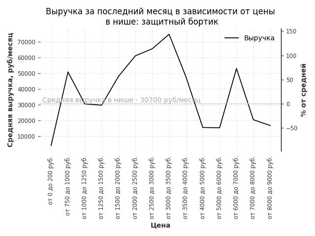 Средняя выручка в нише - 30700 руб./месяц. Максимальная выручка 74800 руб./месяц, на 140% больше среднего в нише, была при цене от 3000 до 3500 руб. руб.