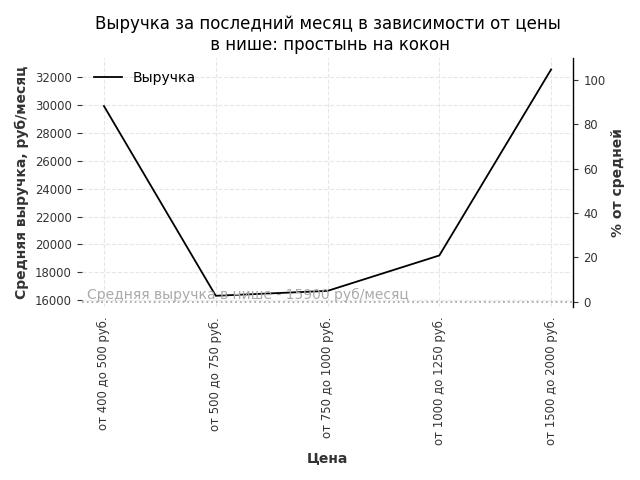 Средняя выручка в нише - 15900 руб./месяц. Максимальная выручка 32500 руб./месяц, на 100% больше среднего в нише, была при цене от 1500 до 2000 руб. руб.