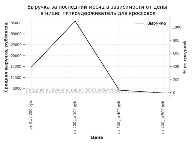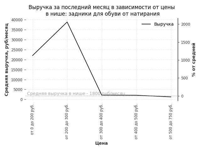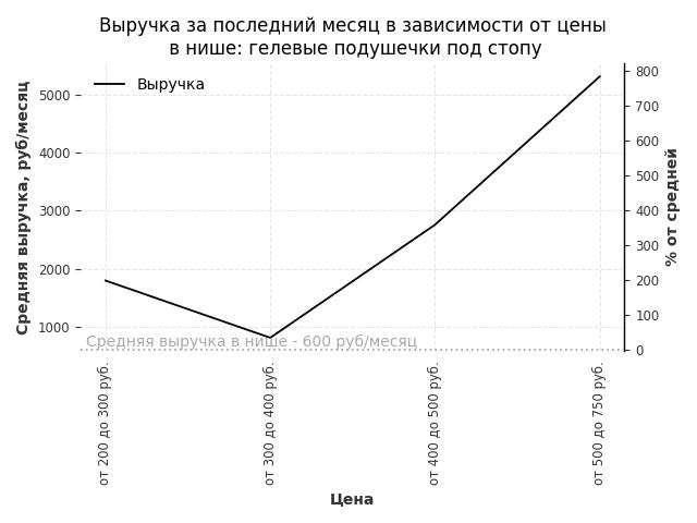 Средняя выручка в нише - 600 руб./месяц. Максимальная выручка 5300 руб./месяц, на 780% больше среднего в нише, была при цене от 500 до 750 руб. руб.