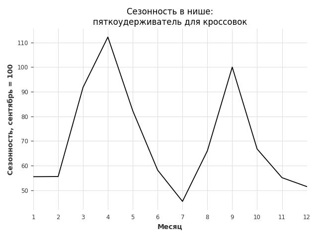 Сезонность в нише средняя. Пик сезонных продаж в нише - апрель. В ближайшие месяцы можно ожидать сезонного спада продаж до 49%.