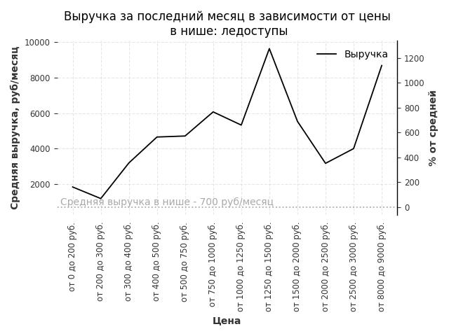 Средняя выручка в нише - 700 руб./месяц. Максимальная выручка 9600 руб./месяц, на 1270% больше среднего в нише, была при цене от 1250 до 1500 руб. руб.