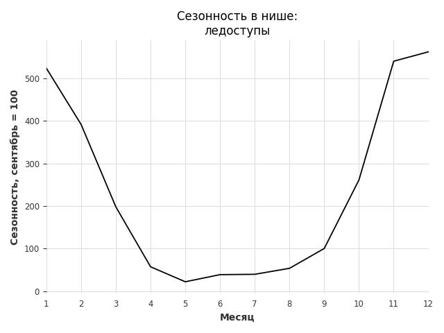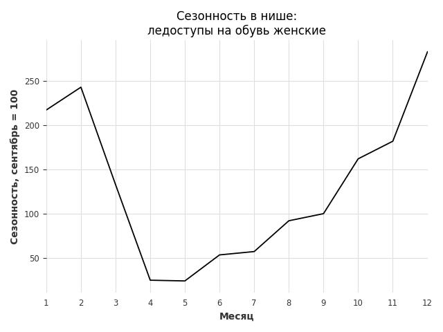 Сезонность в нише сильная. Пик сезонных продаж в нише - январь. В ближайшие месяцы можно ожидать сезонного роста продаж до 238%.