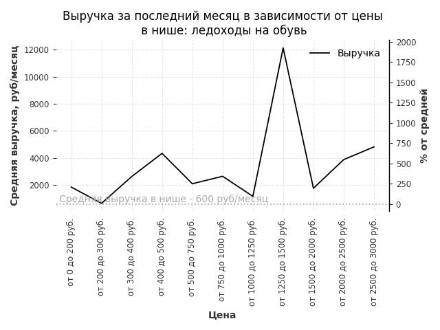 Средняя выручка в нише - 600 руб./месяц. Максимальная выручка 12100 руб./месяц, на 1920% больше среднего в нише, была при цене от 1250 до 1500 руб. руб.