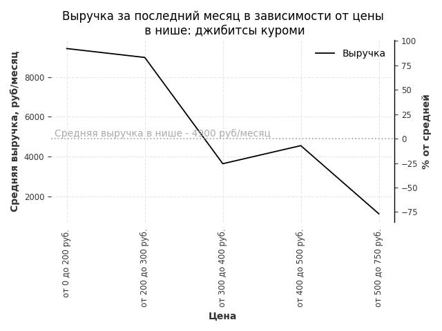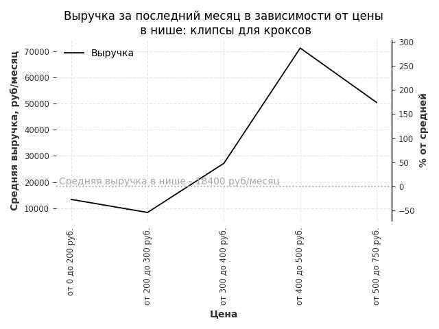 Средняя выручка в нише - 18400 руб./месяц. Максимальная выручка 71300 руб./месяц, на 290% больше среднего в нише, была при цене от 400 до 500 руб. руб.