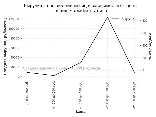 Средняя выручка в нише - 13000 руб./месяц. Максимальная выручка 124000 руб./месяц, на 850% больше среднего в нише, была при цене от 400 до 500 руб. руб.