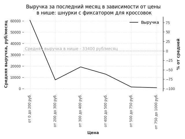 Средняя выручка в нише - 33400 руб./месяц. Максимальная выручка 60500 руб./месяц, на 80% больше среднего в нише, была при цене от 0 до 200 руб. руб.