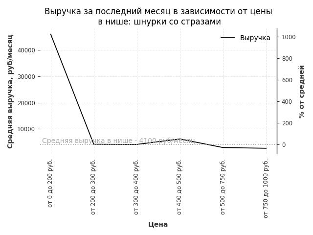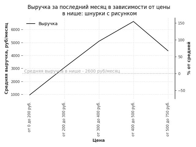 Средняя выручка в нише - 2600 руб./месяц. Максимальная выручка 6600 руб./месяц, на 150% больше среднего в нише, была при цене от 400 до 500 руб. руб.