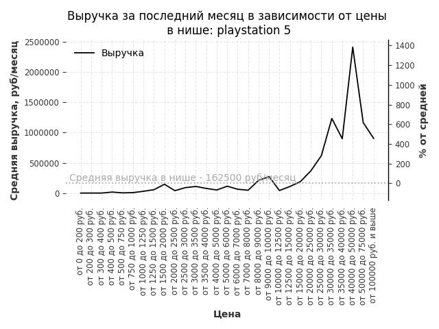 Средняя выручка в нише - 162500 руб./месяц. Максимальная выручка 2410500 руб./месяц, на 1380% больше среднего в нише, была при цене от 40000 до 50000 руб. руб.
