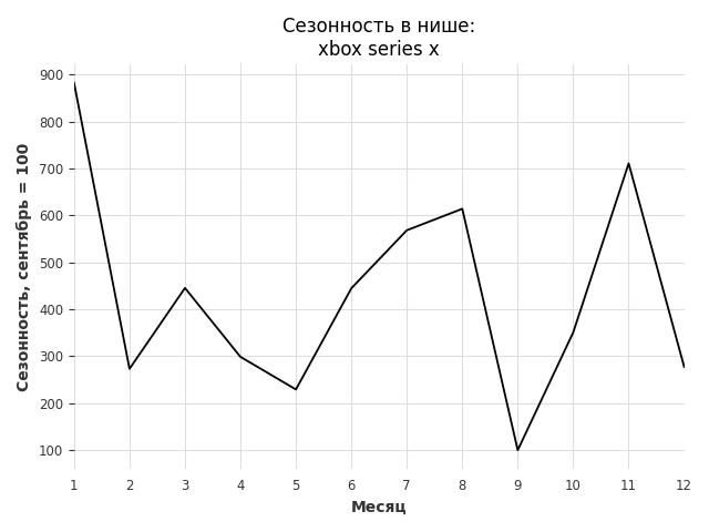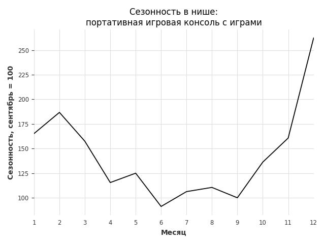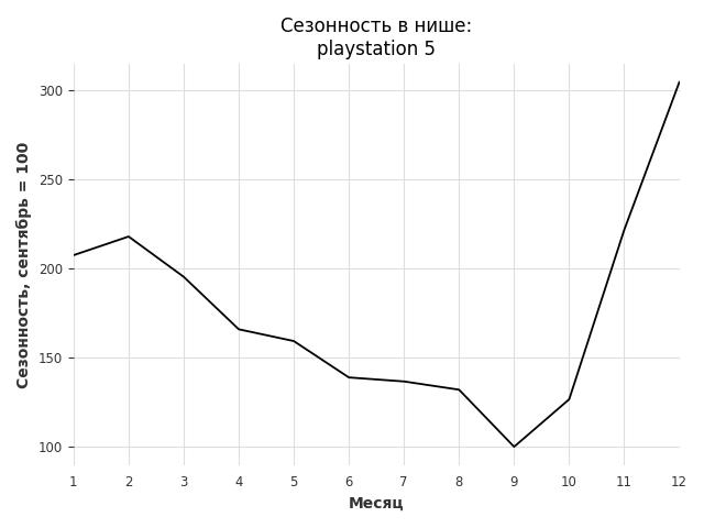 Сезонность в нише сильная. Пик сезонных продаж в нише - январь. В ближайшие месяцы можно ожидать сезонного роста продаж до 610%.