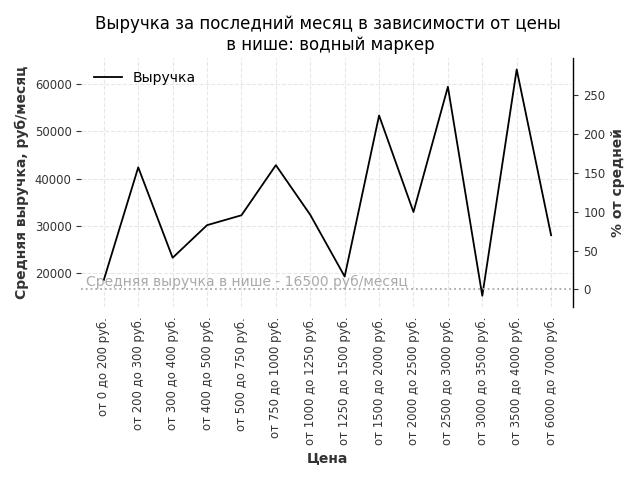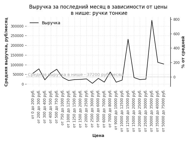 Средняя выручка в нише - 37200 руб./месяц. Максимальная выручка 328900 руб./месяц, на 780% больше среднего в нише, была при цене от 30000 до 35000 руб. руб.