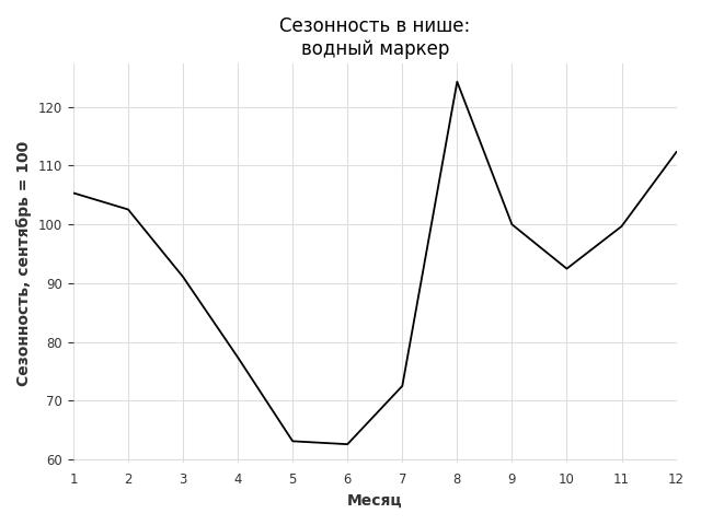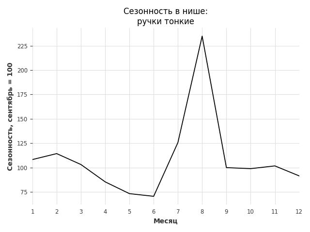 Сезонность в нише средняя. Пик сезонных продаж в нише - август. В ближайшие месяцы сезонность не будет заметно влиять на продажи.