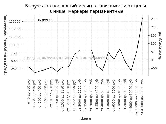 Средняя выручка в нише - 52400 руб./месяц. Максимальная выручка 186600 руб./месяц, на 260% больше среднего в нише, была при цене от 40000 до 50000 руб. руб.