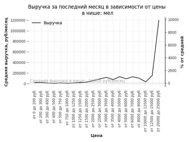 Средняя выручка в нише - 12000 руб./месяц. Максимальная выручка 1194000 руб./месяц, на 9850% больше среднего в нише, была при цене от 20000 до 25000 руб. руб.