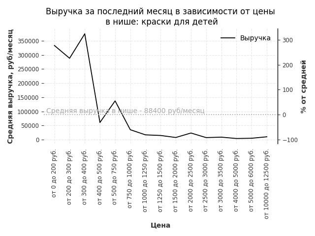 Средняя выручка в нише - 88400 руб./месяц. Максимальная выручка 374400 руб./месяц, на 320% больше среднего в нише, была при цене от 300 до 400 руб. руб.