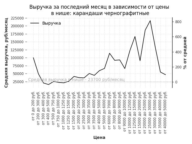 Средняя выручка в нише - 23700 руб./месяц. Максимальная выручка 216500 руб./месяц, на 810% больше среднего в нише, была при цене от 25000 до 30000 руб. руб.