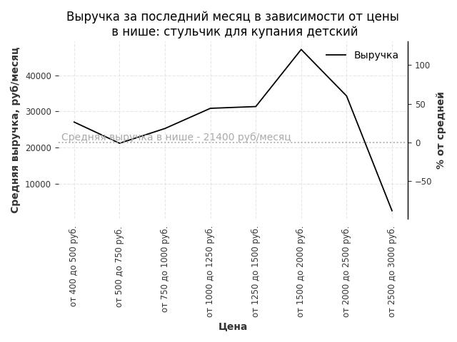 Средняя выручка в нише - 21400 руб./месяц. Максимальная выручка 47100 руб./месяц, на 120% больше среднего в нише, была при цене от 1500 до 2000 руб. руб.