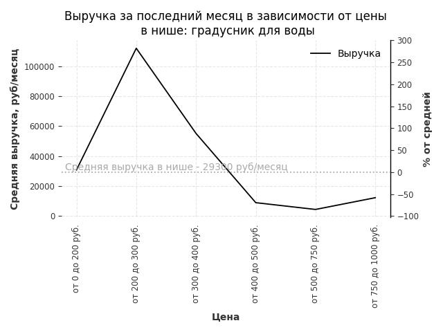 Средняя выручка в нише - 29300 руб./месяц. Максимальная выручка 111900 руб./месяц, на 280% больше среднего в нише, была при цене от 200 до 300 руб. руб.