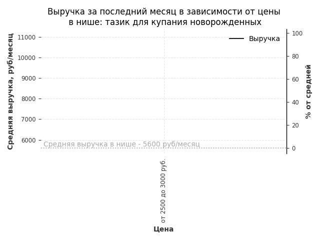 Средняя выручка в нише - 5600 руб./месяц. Максимальная выручка 11100 руб./месяц, на 100% больше среднего в нише, была при цене от 2500 до 3000 руб. руб.