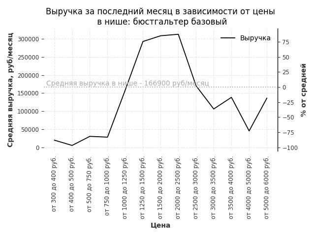 Средняя выручка в нише - 166900 руб./месяц. Максимальная выручка 312600 руб./месяц, на 90% больше среднего в нише, была при цене от 2000 до 2500 руб. руб.