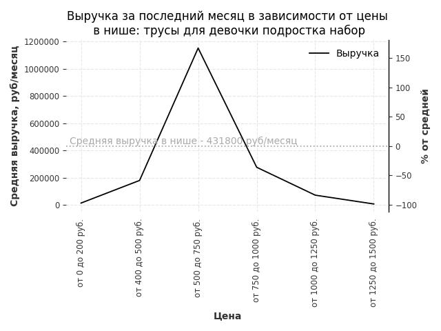 Средняя выручка в нише - 431800 руб./месяц. Максимальная выручка 1151600 руб./месяц, на 170% больше среднего в нише, была при цене от 500 до 750 руб. руб.
