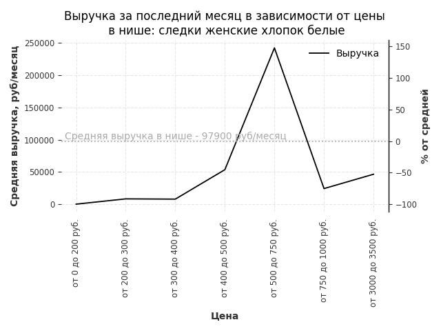 Средняя выручка в нише - 97900 руб./месяц. Максимальная выручка 242200 руб./месяц, на 150% больше среднего в нише, была при цене от 500 до 750 руб. руб.