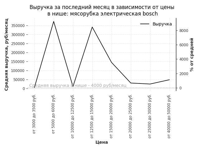 Средняя выручка в нише - 17600 руб./месяц. Максимальная выручка 160400 руб./месяц, на 810% больше среднего в нише, была при цене от 3000 до 3500 руб. руб.