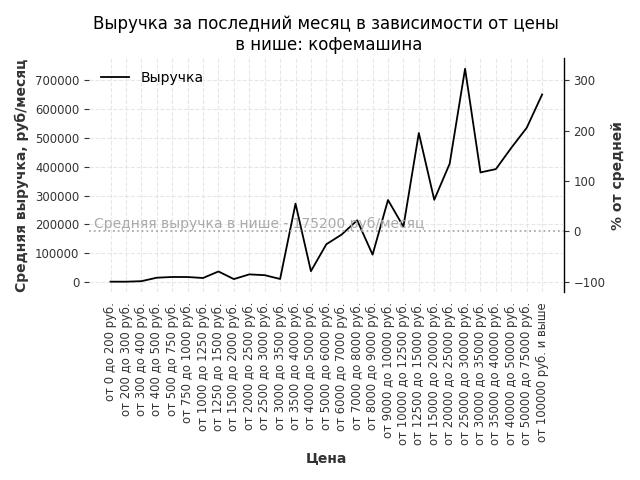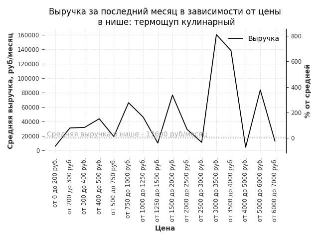 Средняя выручка в нише - 175200 руб./месяц. Максимальная выручка 740600 руб./месяц, на 320% больше среднего в нише, была при цене от 25000 до 30000 руб. руб.