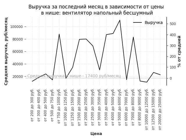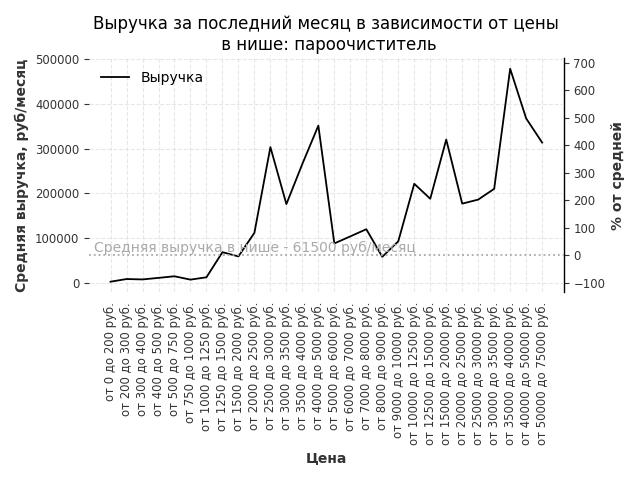 Средняя выручка в нише - 61500 руб./месяц. Максимальная выручка 478200 руб./месяц, на 680% больше среднего в нише, была при цене от 35000 до 40000 руб. руб.