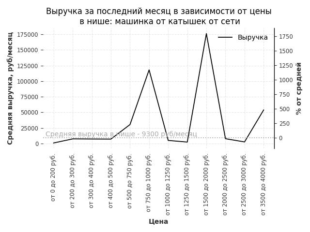 Средняя выручка в нише - 9300 руб./месяц. Максимальная выручка 176300 руб./месяц, на 1800% больше среднего в нише, была при цене от 1500 до 2000 руб. руб.