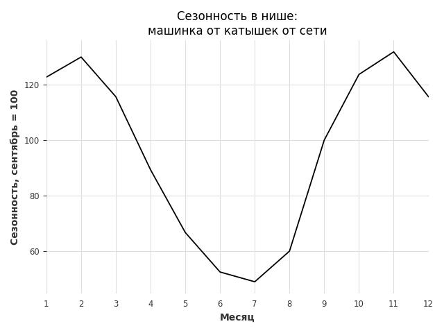 Сезонность в нише сильная. Пик сезонных продаж в нише - май. В ближайшие месяцы можно ожидать сезонного спада продаж до 26%.