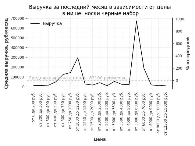 Средняя выручка в нише - 63100 руб./месяц. Максимальная выручка 671000 руб./месяц, на 960% больше среднего в нише, была при цене от 5000 до 6000 руб. руб.