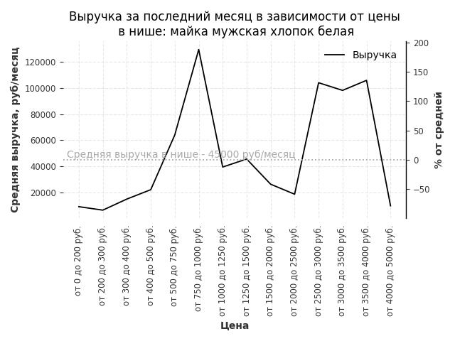 Средняя выручка в нише - 45000 руб./месяц. Максимальная выручка 129600 руб./месяц, на 190% больше среднего в нише, была при цене от 750 до 1000 руб. руб.