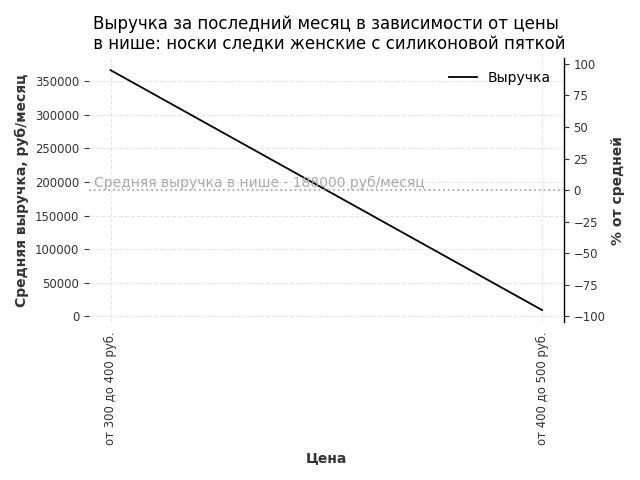 Средняя выручка в нише - 188000 руб./месяц. Максимальная выручка 366500 руб./месяц, на 90% больше среднего в нише, была при цене от 300 до 400 руб. руб.