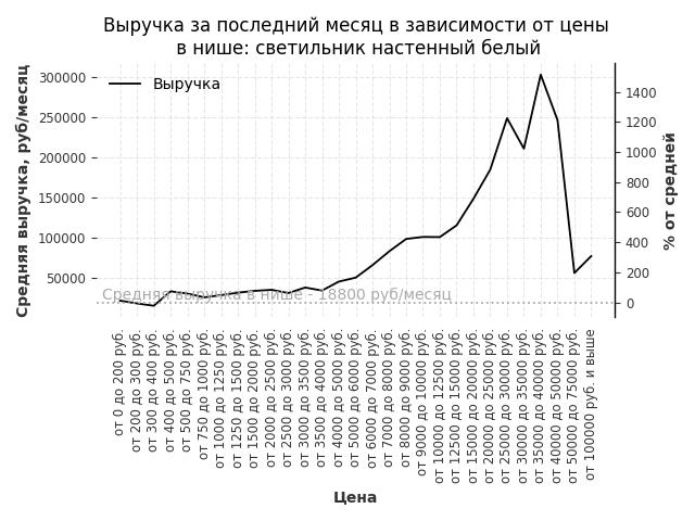 Средняя выручка в нише - 26200 руб./месяц. Максимальная выручка 259000 руб./месяц, на 890% больше среднего в нише, была при цене от 25000 до 30000 руб. руб.