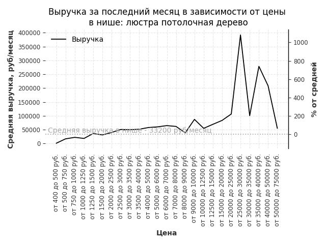 Средняя выручка в нише - 33200 руб./месяц. Максимальная выручка 391900 руб./месяц, на 1080% больше среднего в нише, была при цене от 25000 до 30000 руб. руб.