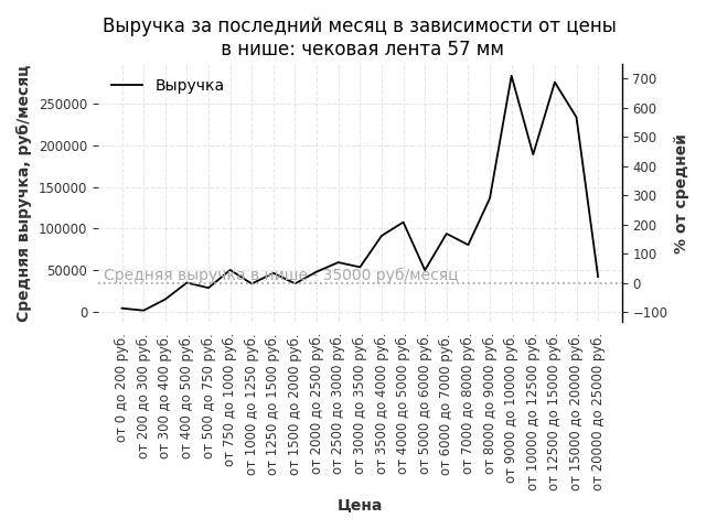 Средняя выручка в нише - 35000 руб./месяц. Максимальная выручка 282900 руб./месяц, на 710% больше среднего в нише, была при цене от 9000 до 10000 руб. руб.