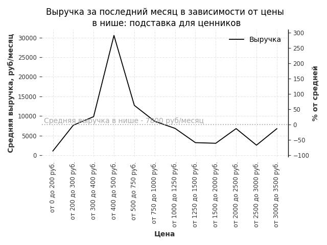 Средняя выручка в нише - 7800 руб./месяц. Максимальная выручка 30500 руб./месяц, на 290% больше среднего в нише, была при цене от 400 до 500 руб. руб.